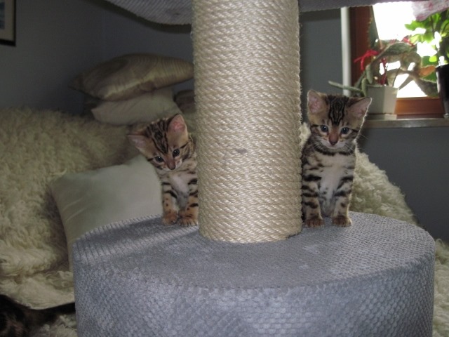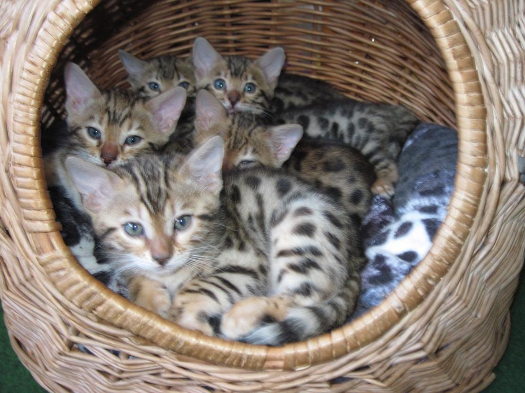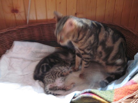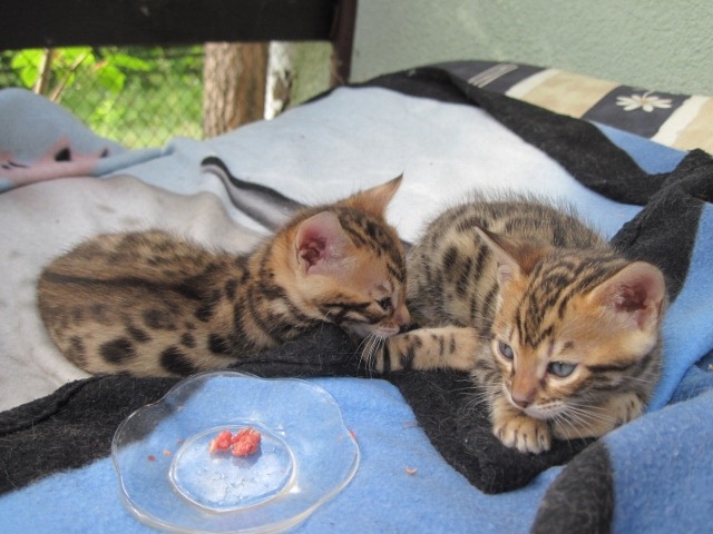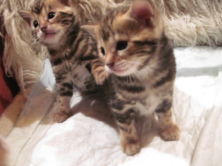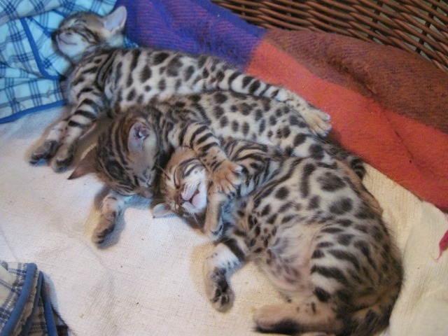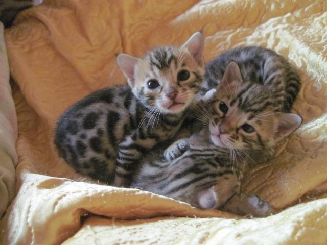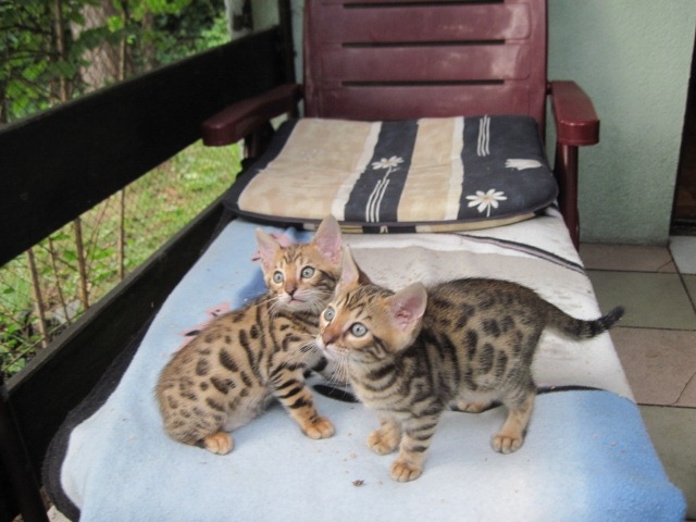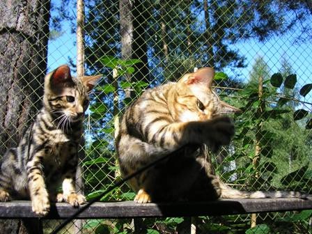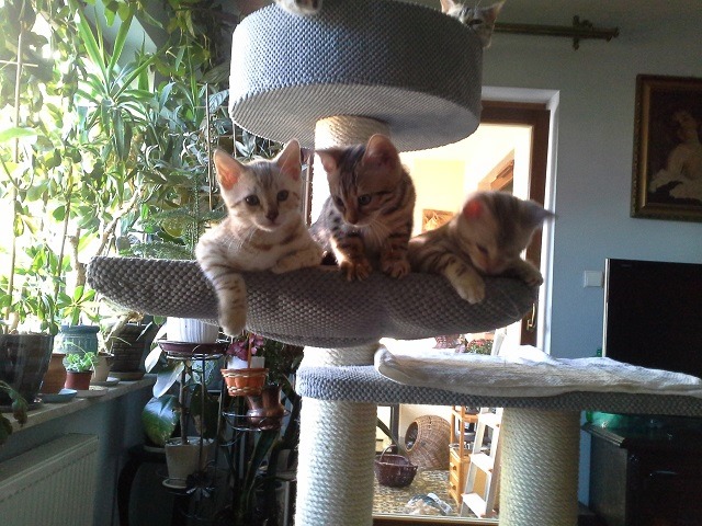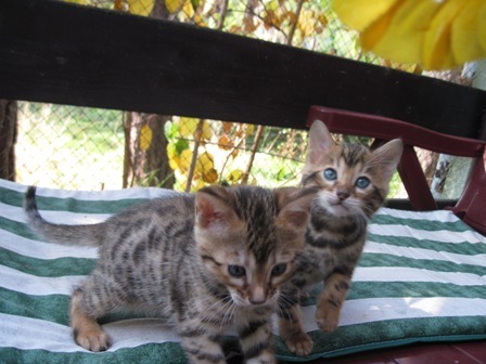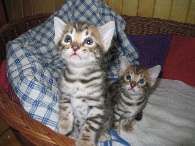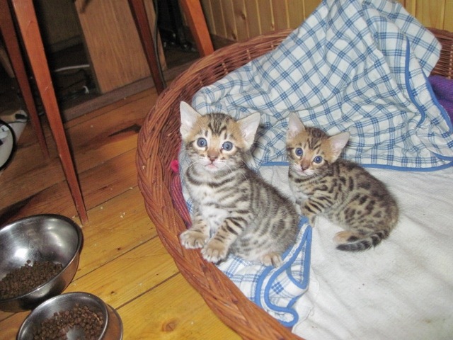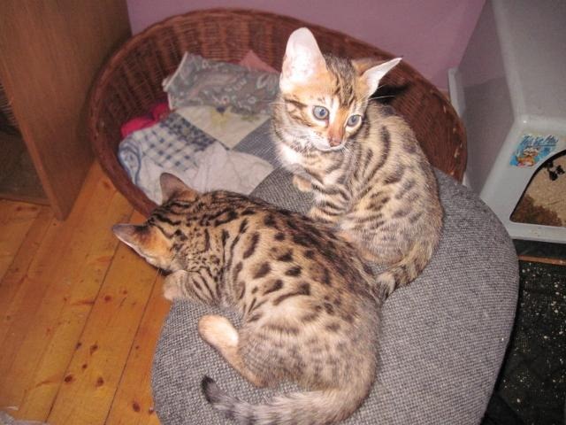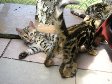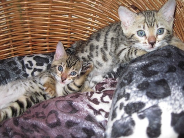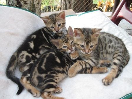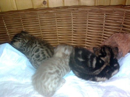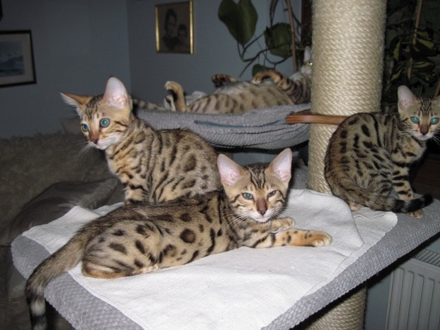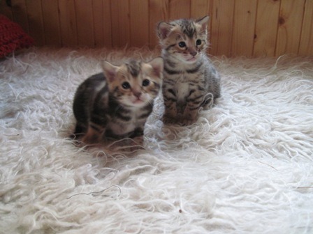 Moje koteczki Dolly i Clinia urodziły w lutym i marcu 2013 kocięta. Są trzy dziewczynki i dwóch chłopców. Maść kociąt to black marbled i brown spotted. Ojcem kociąt jest Europejski Champion /S.C./ Tamleopardens Divine, pochodzący z wiodącej linii skandynawskiej; natomiast ojcem koteczek jest CH Mountainpark Sunshine, co oznacza, że kocięta wywodzą się z doskonałych linii – kanadyjskiej i skandynawskiej.