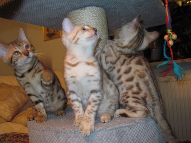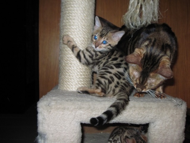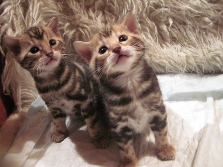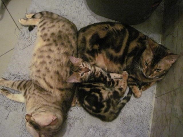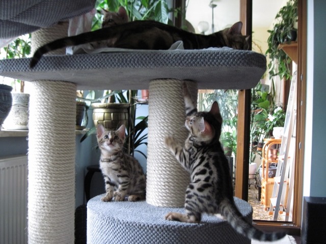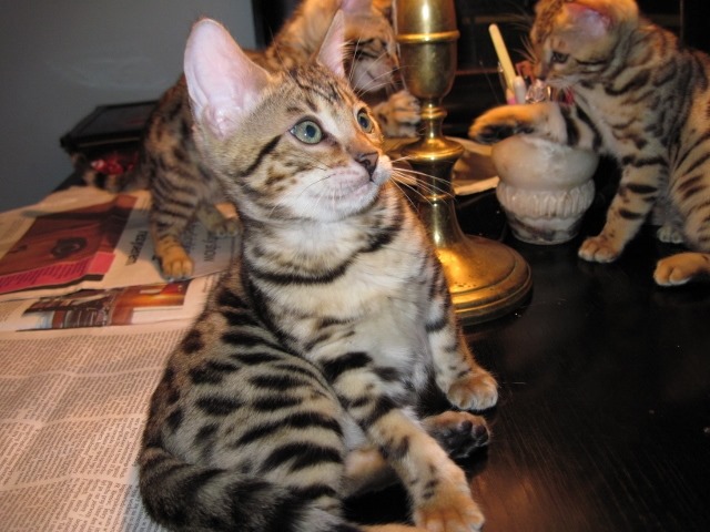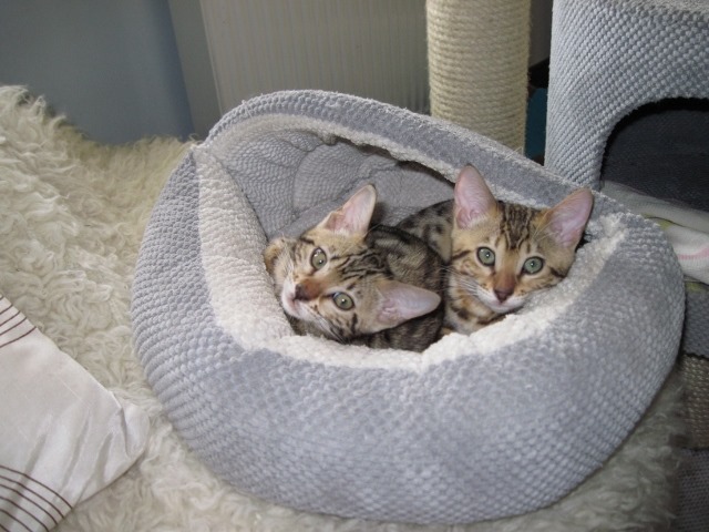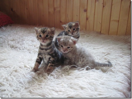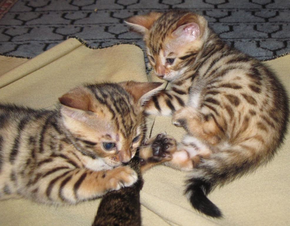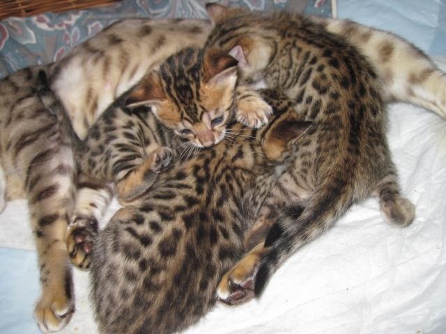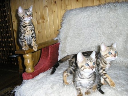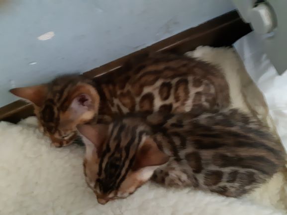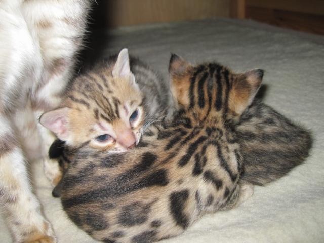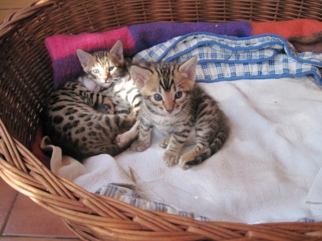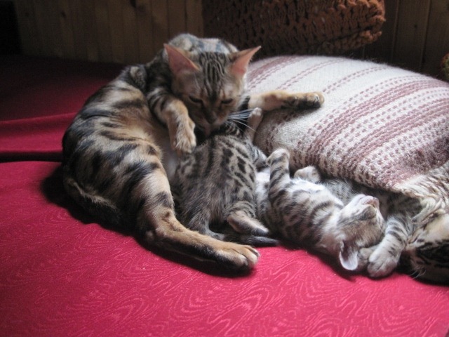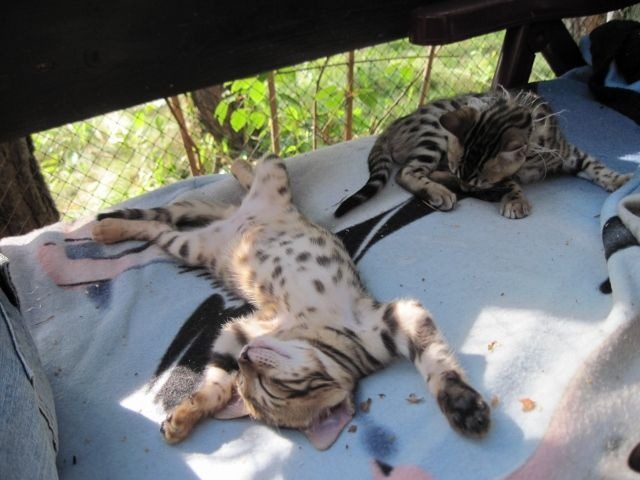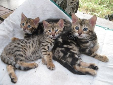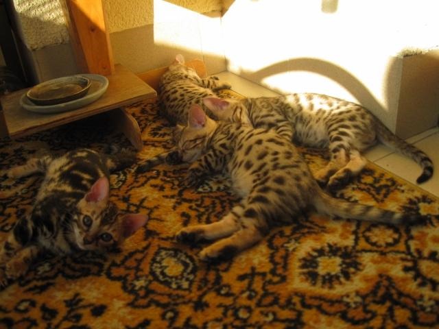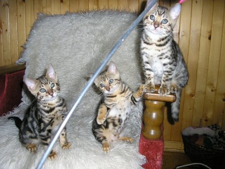 Moje koteczki Dolly i Clinia urodziły w lutym i marcu 2013 kocięta. Są trzy dziewczynki i dwóch chłopców. Maść kociąt to black marbled i brown spotted. Ojcem kociąt jest Europejski Champion /S.C./ Tamleopardens Divine, pochodzący z wiodącej linii skandynawskiej; natomiast ojcem koteczek jest CH Mountainpark Sunshine, co oznacza, że kocięta wywodzą się z doskonałych linii – kanadyjskiej i skandynawskiej.