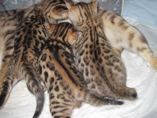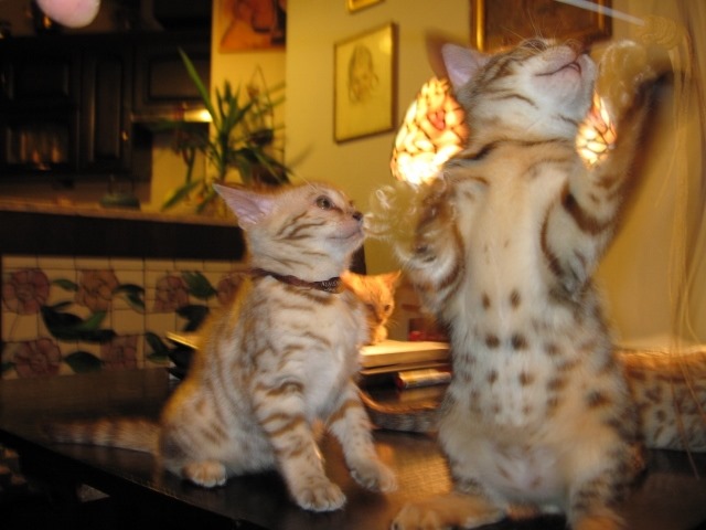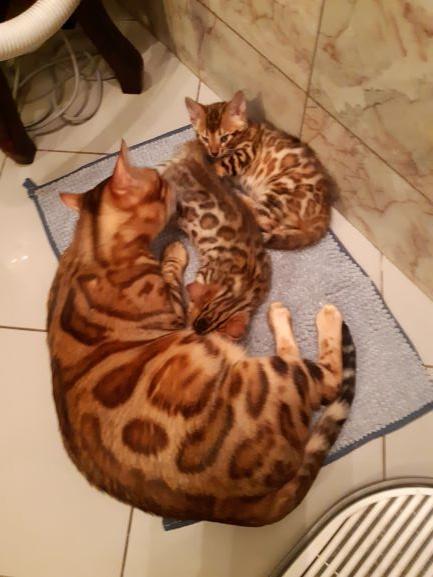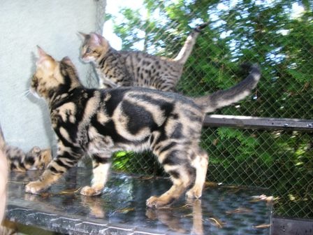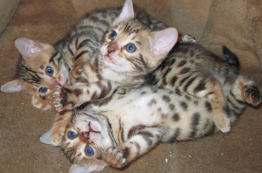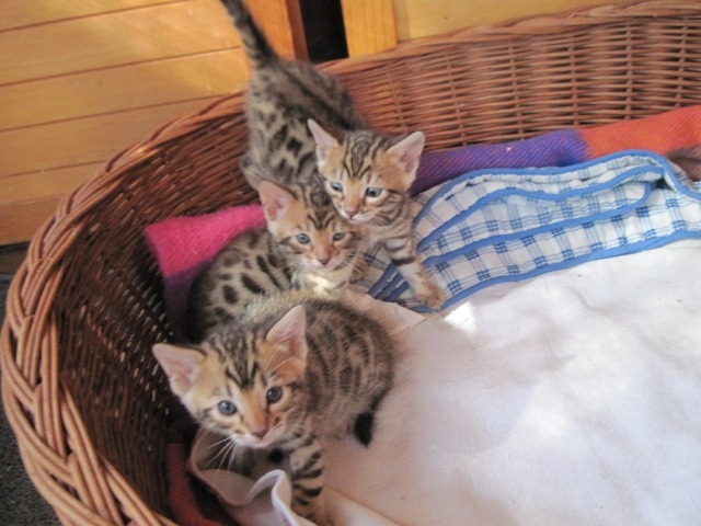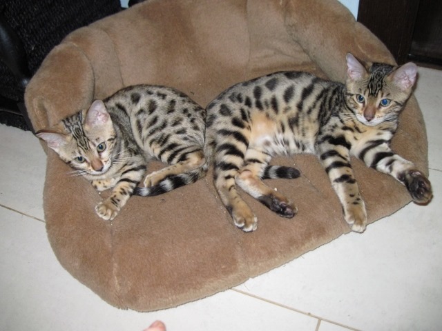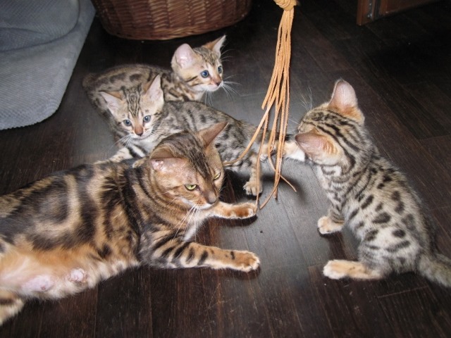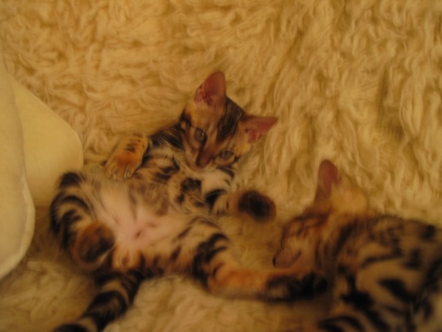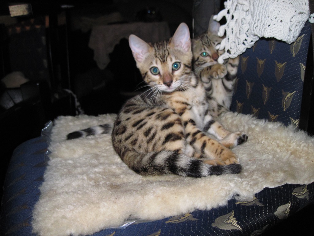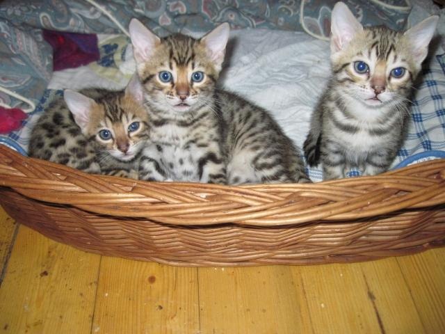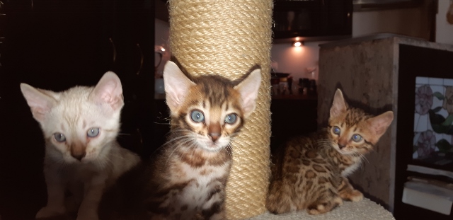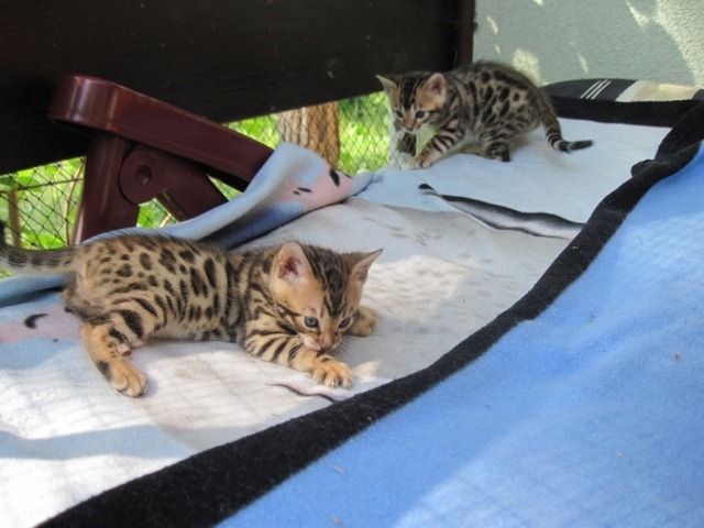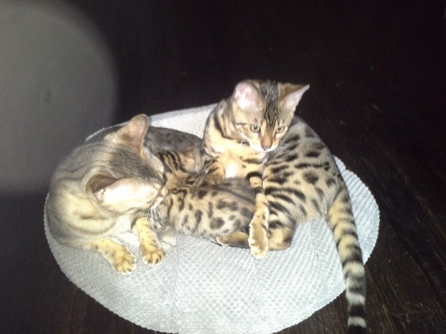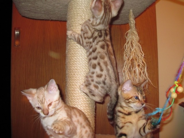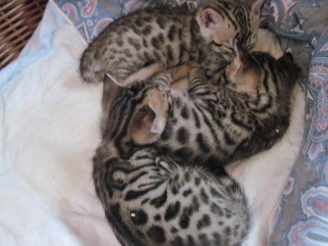Moje koteczki Dolly i Clinia urodziły w lutym i marcu 2013 kocięta. Są trzy dziewczynki i dwóch chłopców. Maść kociąt to black marbled i brown spotted. Ojcem kociąt jest Europejski Champion /S.C./ Tamleopardens Divine, pochodzący z wiodącej linii skandynawskiej; natomiast ojcem koteczek jest CH Mountainpark Sunshine, co oznacza, że kocięta wywodzą się z doskonałych linii – kanadyjskiej i skandynawskiej.
