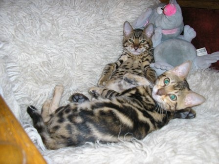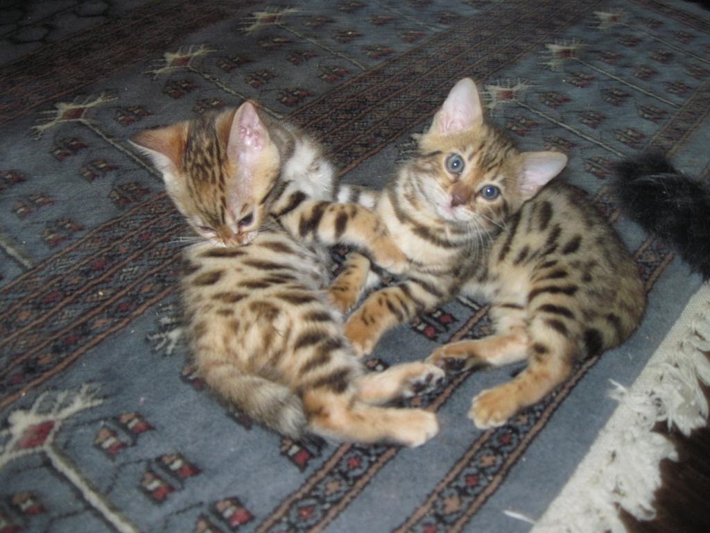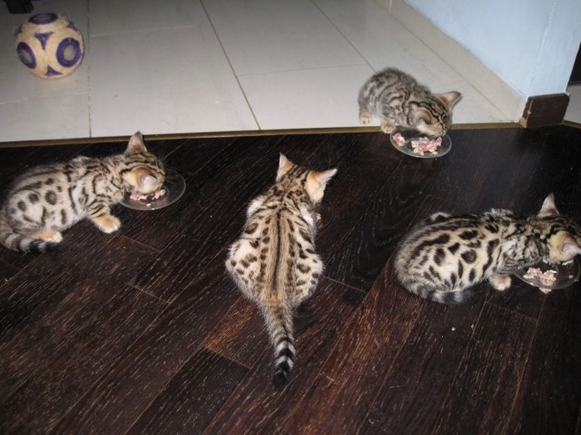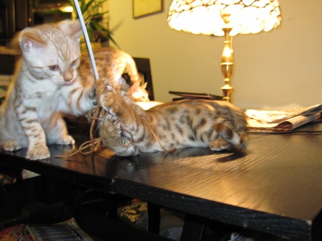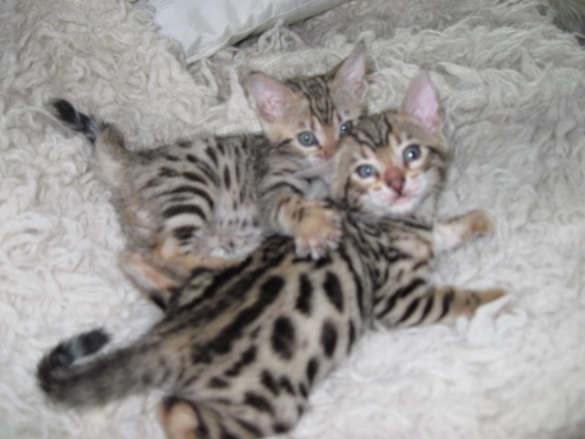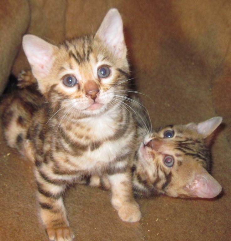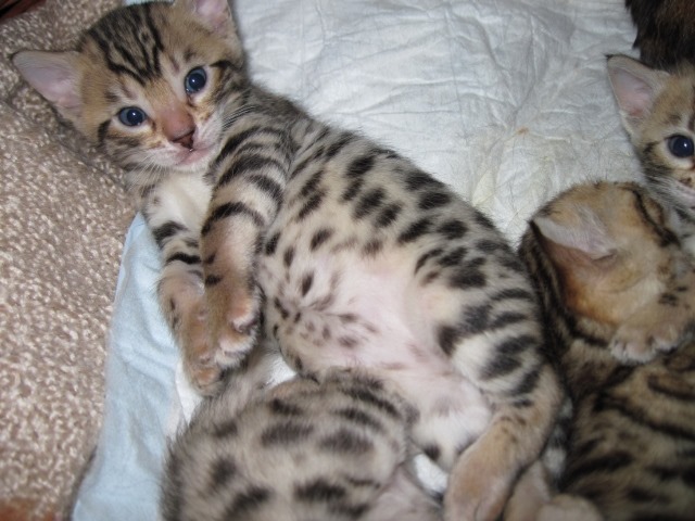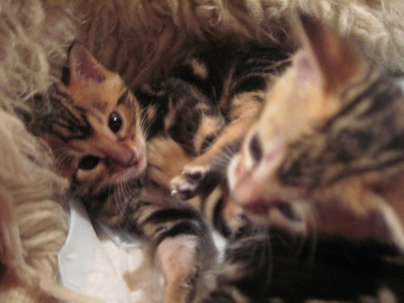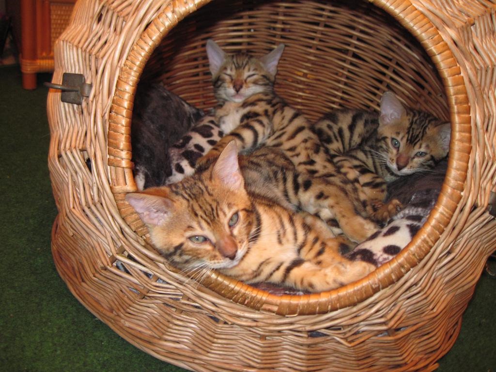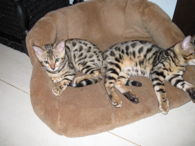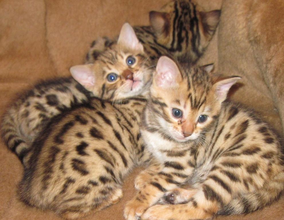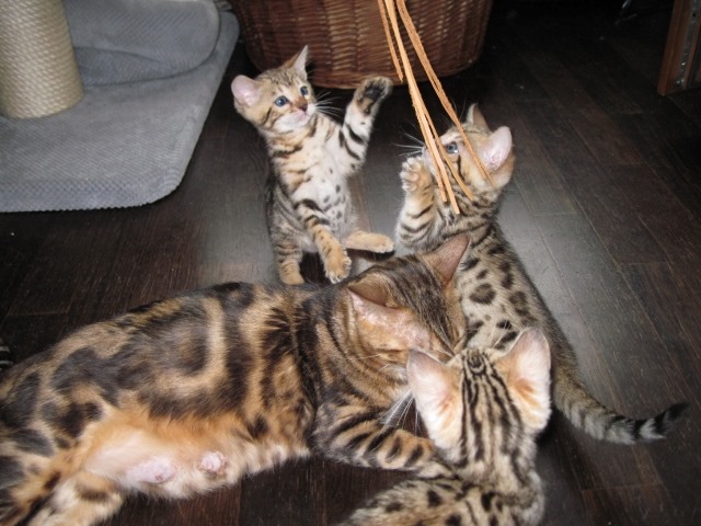 Moje koteczki Dolly i Clinia urodziły w lutym i marcu 2013 kocięta. Są trzy dziewczynki i dwóch chłopców. Maść kociąt to black marbled i brown spotted. Ojcem kociąt jest Europejski Champion /S.C./ Tamleopardens Divine, pochodzący z wiodącej linii skandynawskiej; natomiast ojcem koteczek jest CH Mountainpark Sunshine, co oznacza, że kocięta wywodzą się z doskonałych linii – kanadyjskiej i skandynawskiej.