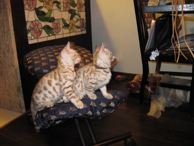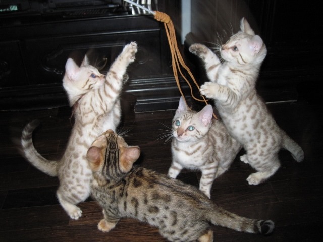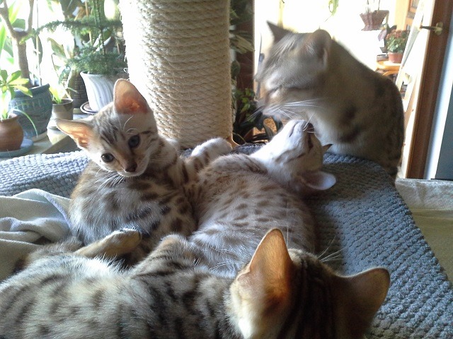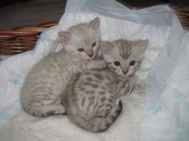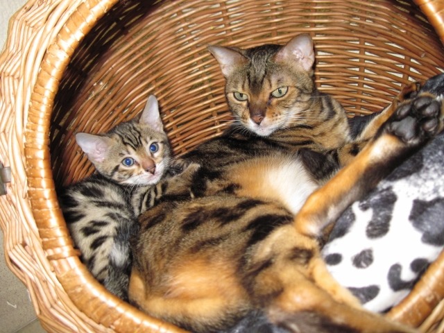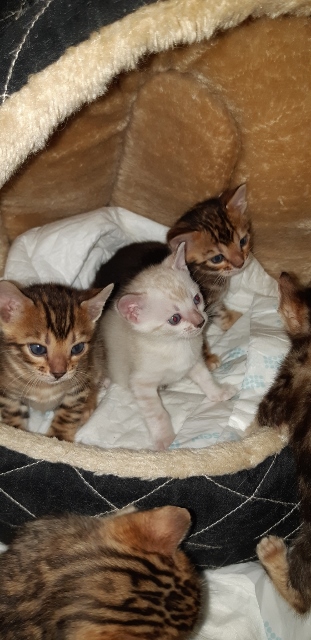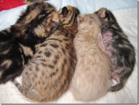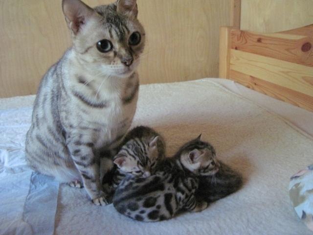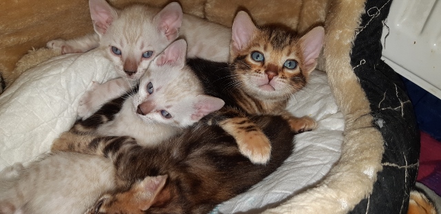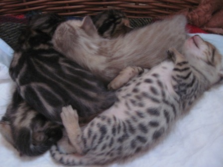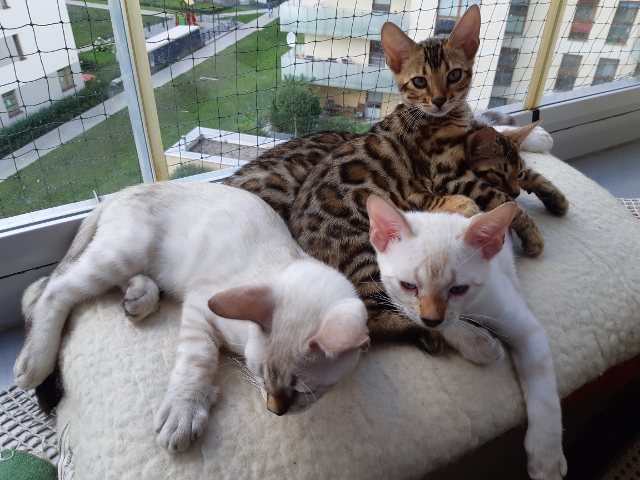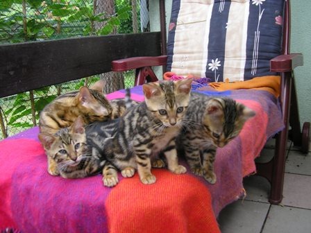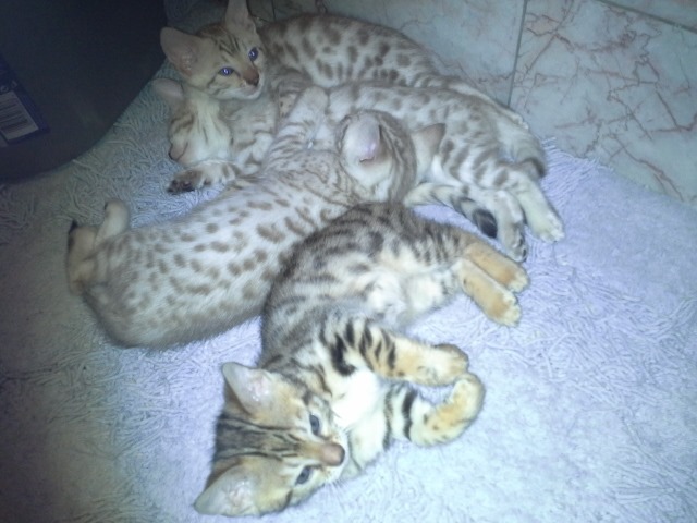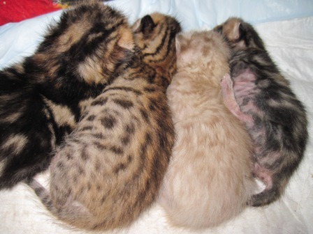 W sierpniu 2011 roku moja koteczka CH Odessa Euforia została szczęśliwą mamą czterech kociat. Ojcem kociąt był, tak jak w latach poprzednich, CH Mountainpark Sunshine. Urodziły się dwie koteczki (maści seal mink spotted i black marbled) oraz dwa kocurki (maści brown spotted i black marbled). Kocięta są pięknie wybarwione, maść o dużym kontraście.